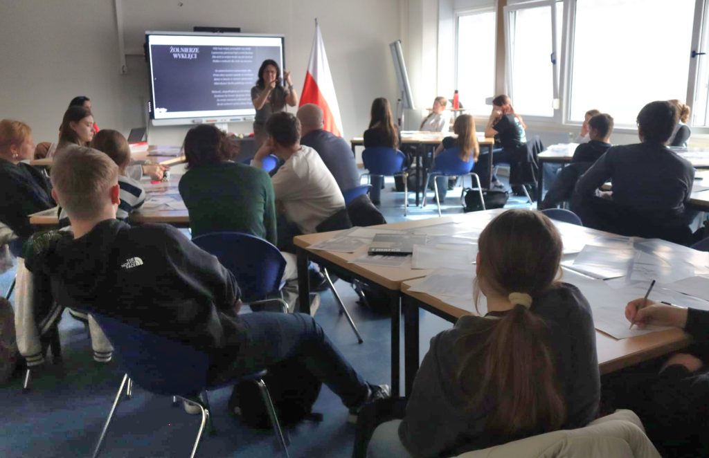 1 marca obchodzimy Narodowy Dzień Pamięci Żołnierzy Wyklętych. O tym, kim oni byli, o jakie idee walczyli oraz co ich ostatecznie spotkało – opowiadała Pani Dyrektor Bożena Cicha, podczas sobotniego wykładu dla klas starszych (VI, VII, VIII, LO). Temat trudny do przekazania, ponieważ dotyka rzeczy ostatecznych i okrutnych, na które brak wytłumaczenia. Słów nacechowanych negatywną energią jak: mord, gwałt, bestialstwo nie sposób było uniknąć, opowiadając o losach Niezłomnych – tylko dlaczego? Przecież jest już po wojnie?… Pani Dyrektor z perspektywy historyka przybliżyła uczniom, jak wyglądała sytuacja po wkroczeniu wojsk sowieckich w 1944 roku. Ich pomoc w wyzwoleniu kraju z rąk Niemców nie była początkiem czegoś dobrego, a o niepodległą Polskę nadal trzeba było walczyć. Zmieniła się nazwa wroga, charakter walki z nim oraz stopień bestialstwa. Opowiedziane w skrócie losy czołowych przedstawicieli Niezłomnych, w tym: Witolda Pileckiego, Augusta Emila Fieldorfa czy Danuty Siedzikówny pozwoliły naszym uczniom wyobrazić sobie skalę okrucieństwa i niedorzeczności, jakie wówczas funkcjonowały. Omawiając trudy polskiego powojennego podziemia niepodległościowego, Pani Bożena Cicha przywołała utwór „Biały krzyż”, którego słowa i muzyka idealnie opisują losy naszych bohaterów; odczytaliśmy również wspólnie utwór „Żołnierze wyklęci”.