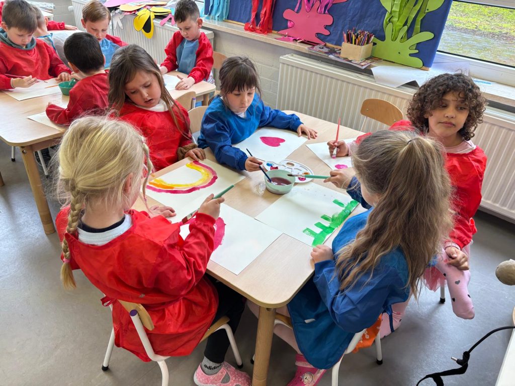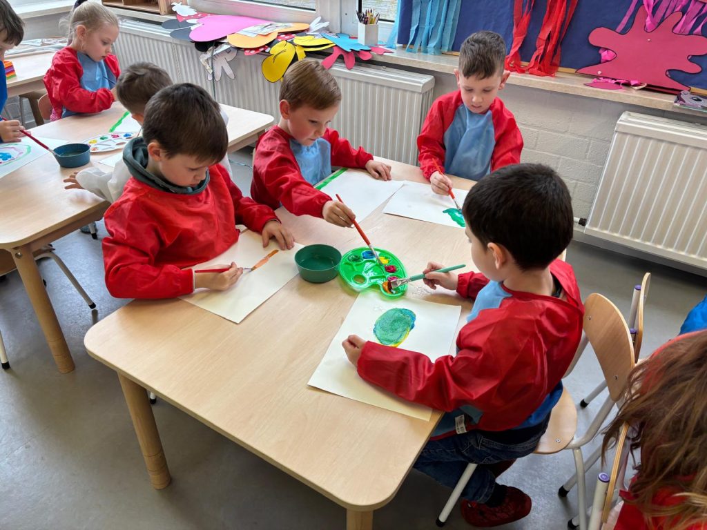W grupach przedszkolnych Biedronki, Pszczółki, Motylki i Świetliki odbyły się wyjątkowe zajęcia pod hasłem „W krainie kolorów”. Tego dnia dzieci miały okazję odkrywać świat barw poprzez różnorodne aktywności plastyczne i ruchowe, a także uczyć się poprzez zabawę i wspólne działanie. Podczas zajęć przedszkolaki uczyły się rozpoznawać i nazywać kolory, a także wskazywać i wymieniać przedmioty z najbliższego otoczenia w określonych barwach. Najmłodsze dzieci z dużym zaangażowaniem uczestniczyły w zabawach dydaktycznych, które pomagały im utrwalać poznane nazwy kolorów. Dużym zainteresowaniem cieszyły się doświadczenia z farbami. Dzieci eksperymentowały, mieszając barwy podstawowe i z zaciekawieniem obserwowały, jakie nowe kolory powstają. Była to dla nich nie tylko świetna zabawa, ale również okazja do rozwijania umiejętności poznawczych i nauka wyciągania pierwszych wniosków. W części plastycznej przedszkolaki malowały farbami, tworząc kolorowe i pełne wyobraźni prace. Każda z nich była wyjątkowa i odzwierciedlała dziecięcą kreatywność, a dodatkowo dzieci miały okazję rozwijać zdolności manualne. Nie zabrakło także aktywności ruchowych – dużą radość sprawiła dzieciom gra w Twistera, która dostarczyła wielu emocji, śmiechu i pozytywnej energii. Zabawa ta pozwoliła dzieciom połączyć naukę kolorów z ruchem i integracją w grupie.